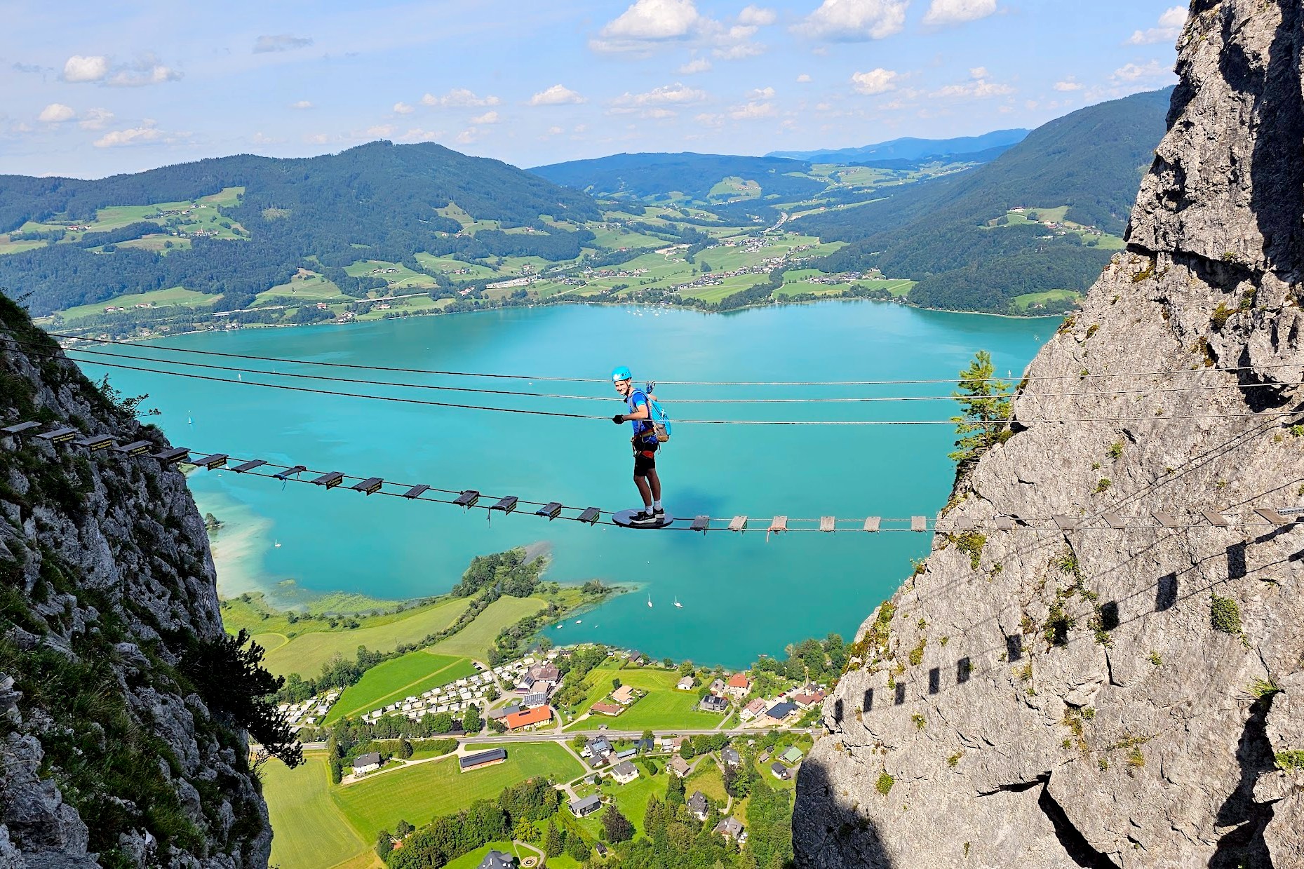 * פראטה לאורך מצוק סובב אגם כחול – דמיינו את עצמכם באויר (בעזרת הפראטה, סולמות וגשרים תלויים) מעל מי האגם ומול נופי הרים מושלגים!